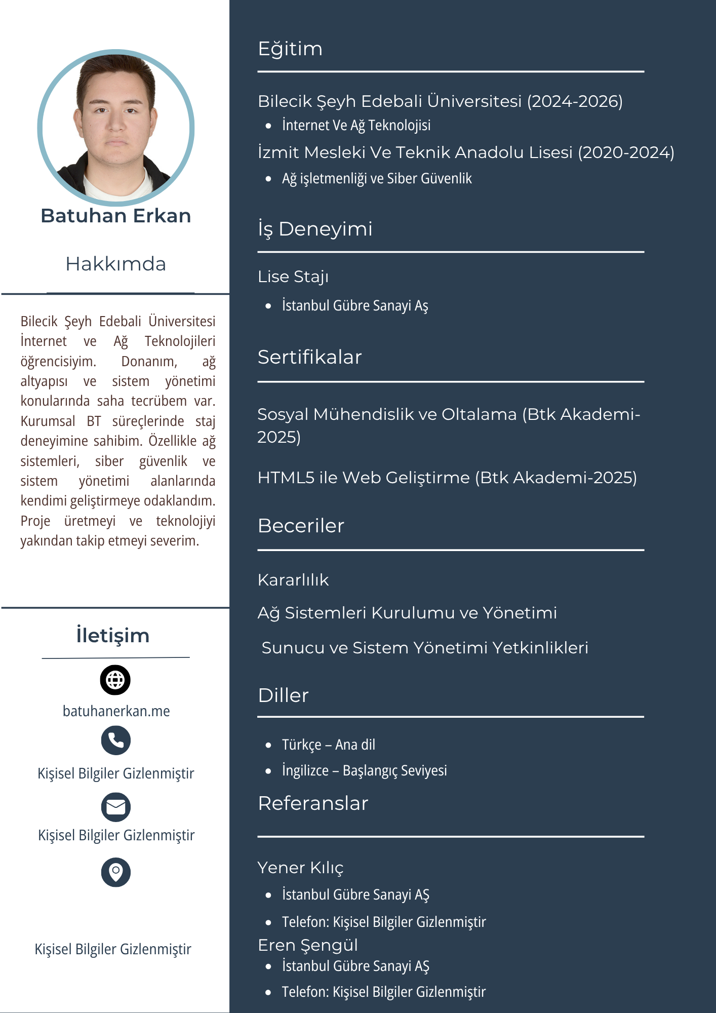 Şu anda Bilecik Şeyh Edebali Üniversitesi’nde İnternet ve Ağ Teknolojileri bölümünde öğrenim görüyorum. Lise dönemimde, Yıldızlar Yatırım Holding iştiraki olan İstanbul Gübre Sanayi A.Ş.’de bilgi işlem departmanında 9 ay süren bir staj programına katılarak kurumsal BT süreçlerine erken yaşta dahil oldum. Bu süreçte donanım kurulumu, ağ bağlantısı sorunları, yazılım destekleri ve kullanıcı taleplerine müdahale gibi görevlerde aktif rol aldım. Hem sahada hem masa başında gerçek dünya tecrübesi kazandım. Teknolojiye olan ilgim ve sistemlere olan merakım beni bu alanda daha derinleşmeye yöneltti. Şu anda hem teorik bilgimi artırıyor hem de bu bilgiyi pratiğe dökme fırsatlarını arıyorum. Hedefim, ağ sistemleri, siber güvenlik ve sistem yönetimi gibi alanlarda uzmanlaşmak; gelişen dünyada güvenilir ve sağlam dijital altyapılar kuran ekiplerin bir parçası olmak.